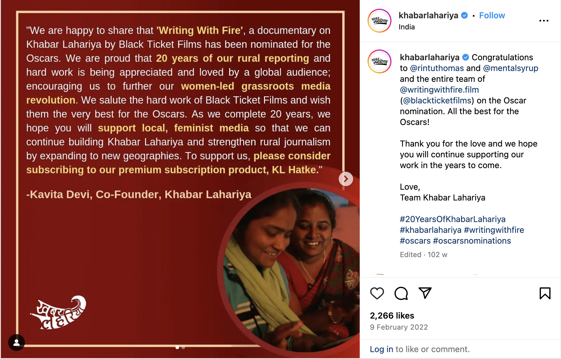 READ ARTICLEIn the same month, speaking to a journalist of Business Doc Europe, Meera spoke about the impact of Writing With Fire on her and her organization: