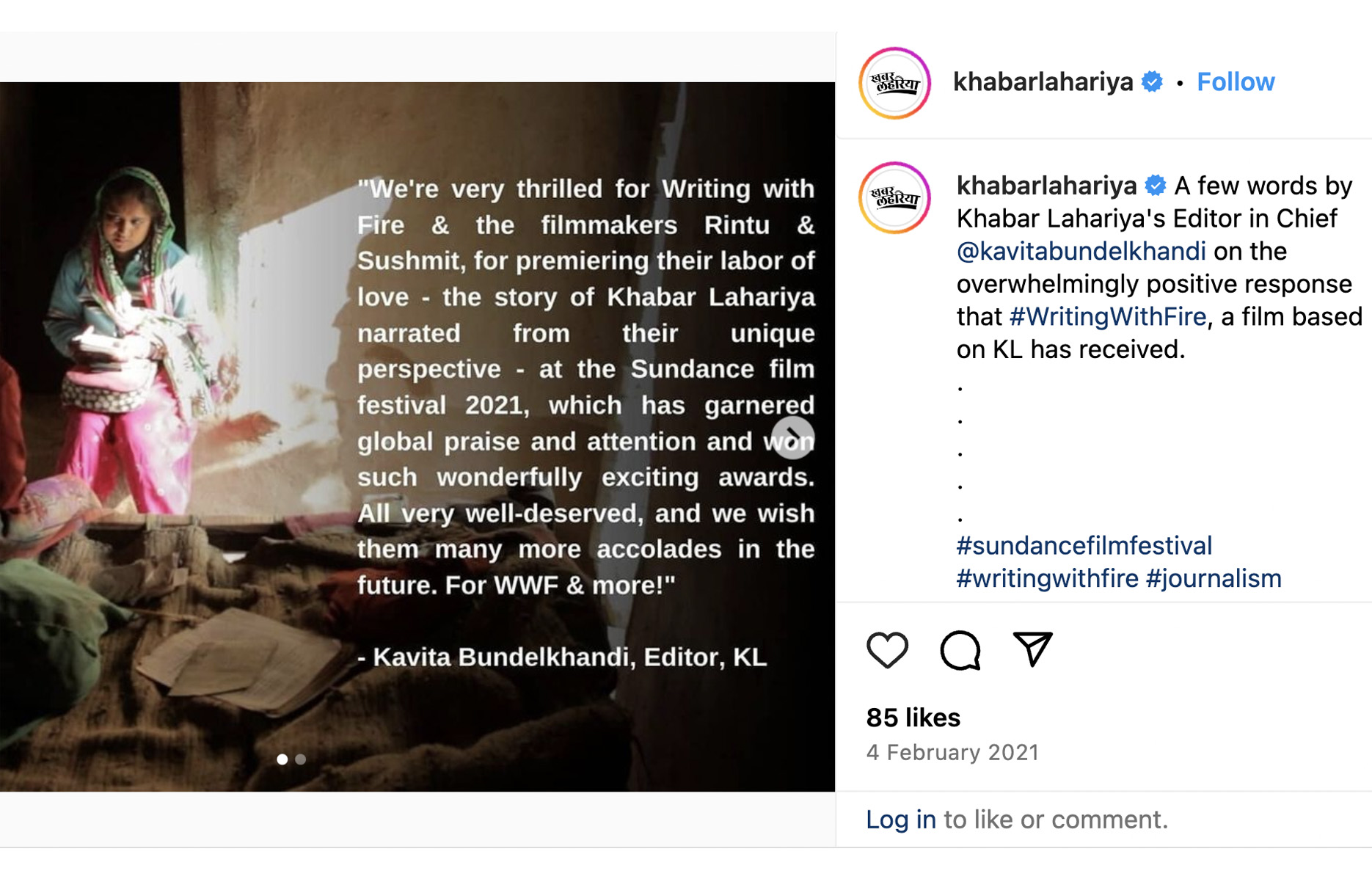 In 2021, the year of the film's release, the impact strategy was amplified as the film met its first audiences across the globe. The first part of this was to bring Hindi-speaking journalists from Khabar Lahariya to international facing events and build a community around them. Before the world premiere at the Sundance Film Festival (Jan 2021), the film was screened in Uttar Pradesh for all the protagonists, an emotional moment of joy, tears and applause shared by everyone involved behind and the in front of the camera. Kavita Devi, the co-founder of Khabar Lahariya, responding to the film and its significance for the institution says: